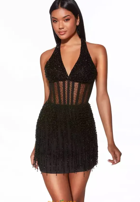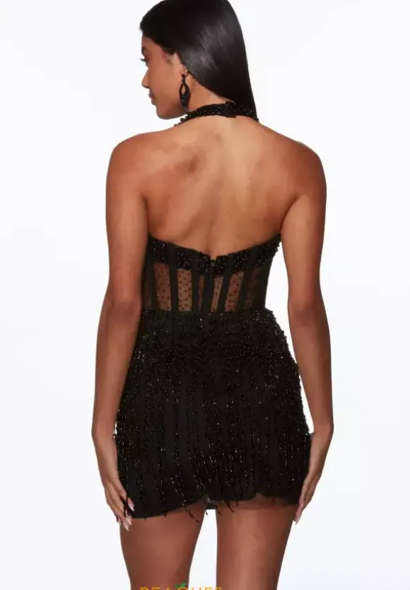 Be the center of attention at any event you attend when you show up wearing this dramatic short fitted dress by Alyce Paris style 40043. A flattering halter v neckline that has ravishing beadwork making you shimmer from any angle. The captivating corset will give you that hour glass look. The fringe on the bottom skirt complete the fun look.