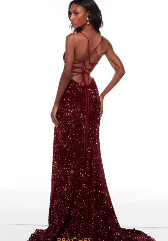 Show stopping Alyce Paris long dress 61186 features a slim fitting silhouette that you are looking for. This sexy fitted dress has a scoop neckline and side cutouts along the bodice. An adjustable lace up in the back give it that snug fit. A glamorous thigh high front side slit and sweeping train complete this look.