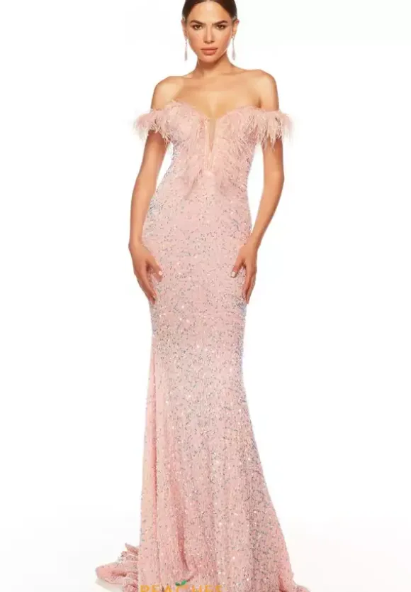 Step out in the stunning gown 61373 by Alyce Paris. This fitted dress features cap sleeves adorned with glamorous feathers and lined with dazzling beading, which run down the deep V neckline and back style to create a chic, eye catching effect. Mesh covers the V neckline for modesty. The gown is fully sequin beaded and is perfectly finished by a sweeping train.