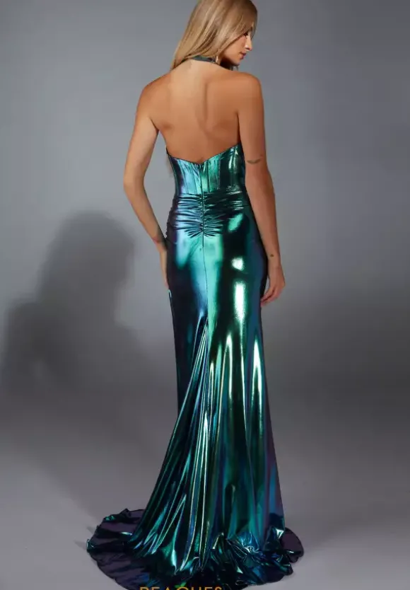 Step out of your comfort zone when wearing this fashion forward long dress by Alyce Paris, style 61787. Showcasing a fitted silhouette with a modest v halter neckline. The corset bodice is sure to snatch your waist in. This number is made out of a novelty material, a thigh high shark bite slit is the prefect final touch.