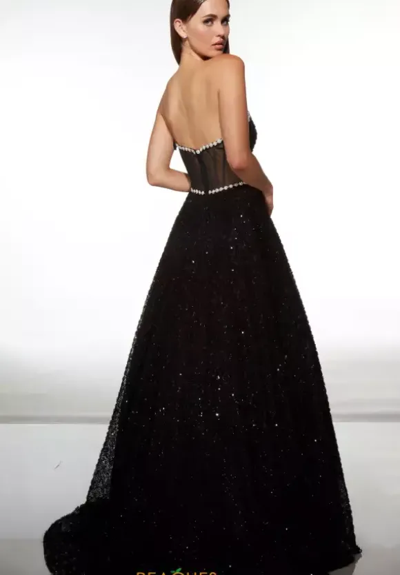 Exude timeless elegance with this luxurious long A line gown by Alyce Paris style number 61982. This glamorous dress features a classy strapless scoop neckline with pearls outlining the semi sheer corset bodice with exposed boning. The dress is entirely made out of a gorgeous glitter tulle and sparkling beadwork. The thigh high slit adds the perfect final touch.