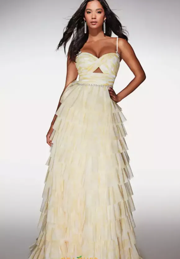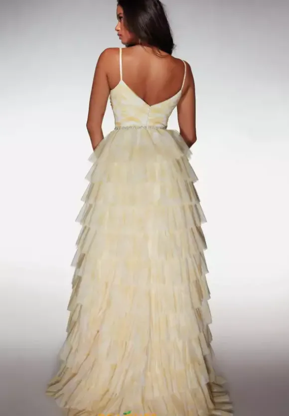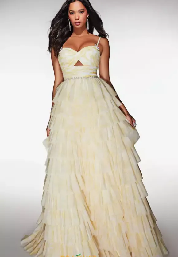 Turn heads at prom in this eye catching Alcye Paris long dress style 62018 made in printed soft mesh shades. The phenomenal dress features a fitted bodice with front cut out with a sweetheart neckline, spaghetti straps, pearl beaded waist embellishments and low back. The long a line skirt has ruffle tier layers for fullness and a back sweep train.