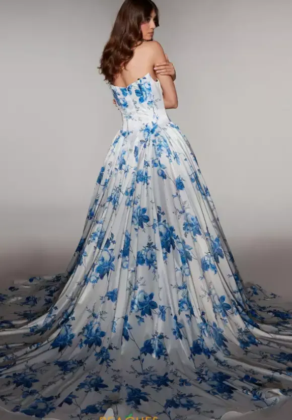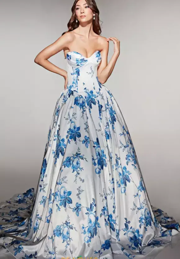 Stay on trend and rock this blue and white floral printed satin Alyce Paris long dress style 62026 to your prom. This impeccable gown showcases a strapless corset with cat-eye neckline and zipper closure back. The long, full ball gown skirt has hip pockets for your cell phone and lip gloss with a floor sweeping hemline.