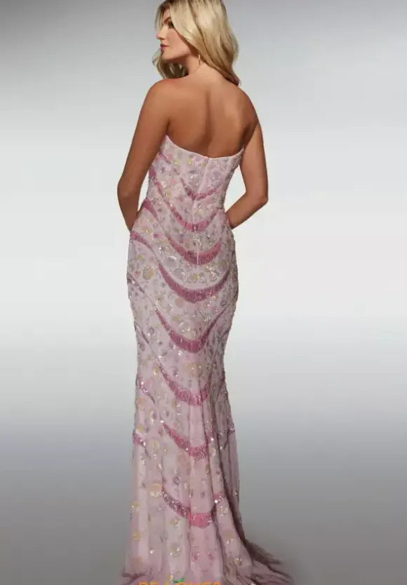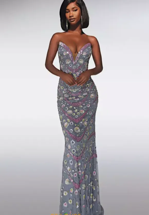 Feel like a piece of art in this amazing beaded Alyce Paris dress style 62038. The strapless deep v neckline has a high zipper enclosed back. The floral beaded multi color design is all hand sewn with the perfect combination of beads, sequins and stones. The dress hugs your frame showing off your shape.