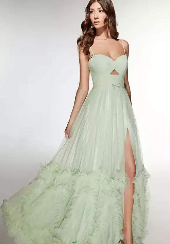 Offered in sage or rosewater colors of soft net fabric, this stellar Alyce Paris long dress style 62043 is the picture perfect choice for prom. This phenomenal gown showcases a lace up back corset with adjustable spaghetti straps, sweetheart neckline and front cut out. The a line, long skirt has ruffle detailing on the bottom half with a floor sweeping hem.