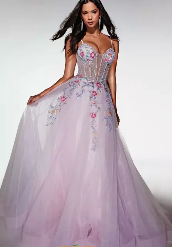 Look like elegance in this shimmering on trend Alyce Paris beaded prom dress style 62068. This dress is trendy from top to bottom with a bedazzled sheer corset bodice that glimmers endlessly paired with the beaded flower embellished tulle skirt. This dress is completed with an adjustable lace back and dramatic sweep train.