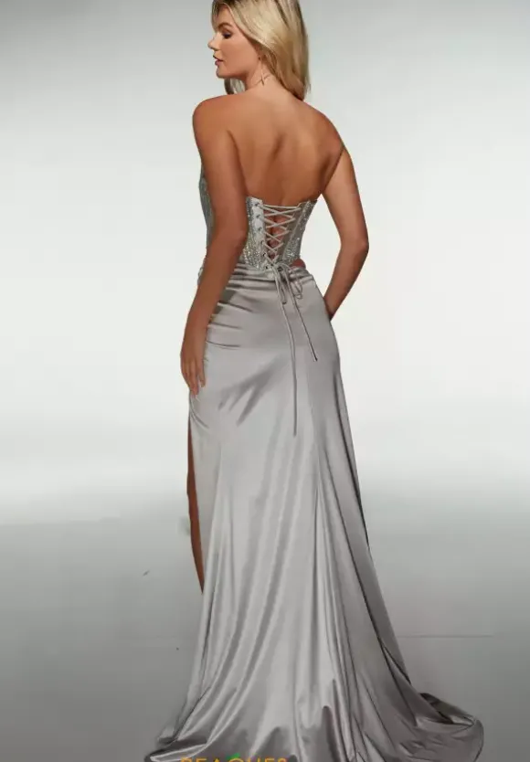 Look like a celebrity in this intriguing fully glistening Alyce Paris floor length prom dress style 62087. Shimmering glitter and dainty beads glisten throughout the fitted corset bodice while subtle pleating asymmetrically tavels down the front of the silky satin thigh high slit skirt. A midriff cutout is featured on a single side of your waist for a flattering effect.