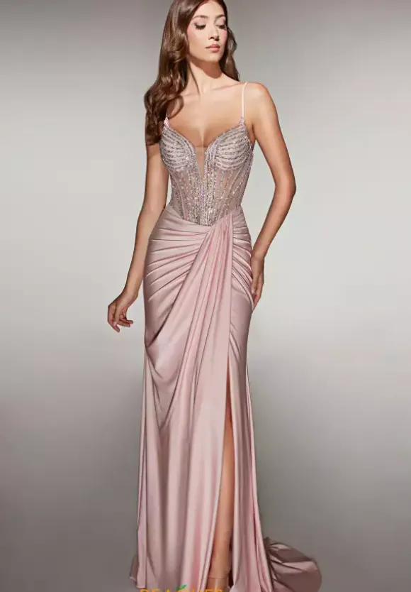Have a red carpet moment and rock this Alyce Paris long fitted dress to your prom. Style 62088 has a gorgeous rhinestone beaded long waisted bodice with a deep v neckline and thin shoulder straps. The rows and rows of beadwork amplify the bodice and lead to a chic jersey long fitted skirt with wrapped ruching and draping in front.