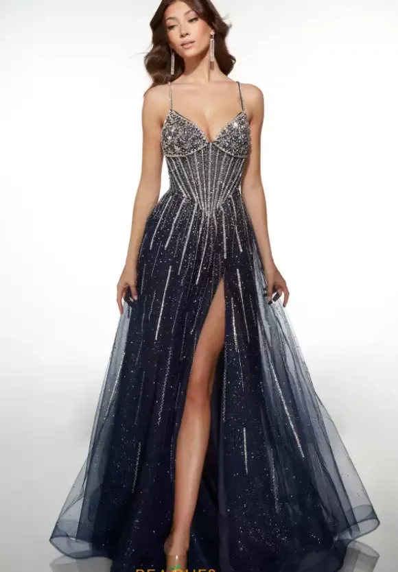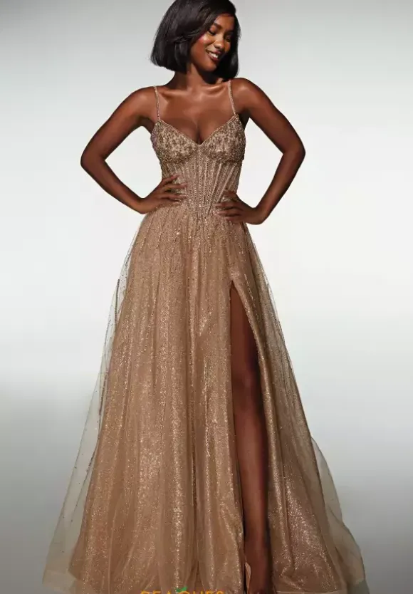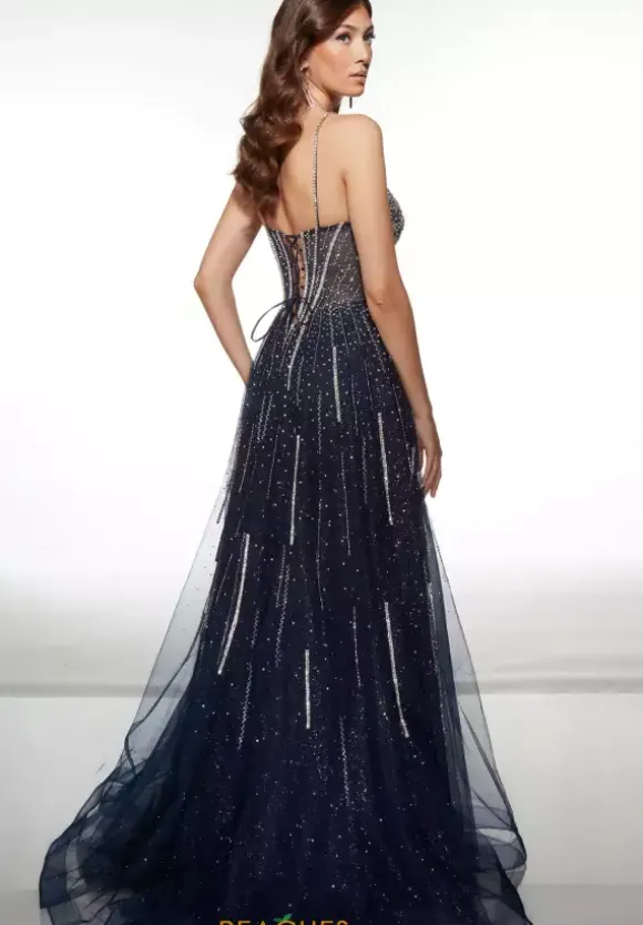 Shimmer, sparkle and radiate from all angles when you wear this Alyce Paris a line dress. Style 62093 details are out of this world, this a v neckline bodice and thin beaded straps. The rhinestone and heat set hot stone shimmer effortlessly and adorn the bodice. The glitter tulle skirt continues that detail down it.