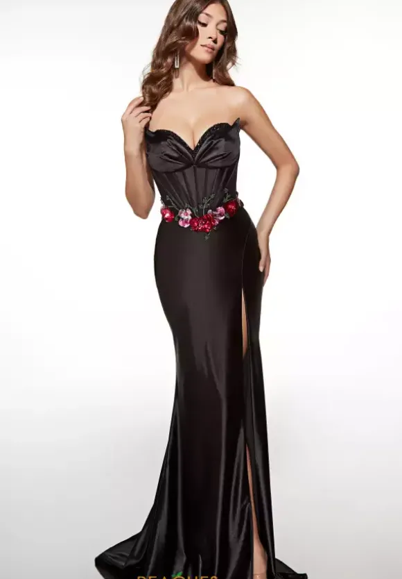 Look sensational at prom in this vintage Alyce Paris long black dress style 62111 made in stretch satin with 3D pink and red flowers with beads at the waist. This stellar gown showcases a strapless, structured corset with a sweetheart neckline with peek a boo black beading and a zipper back. The long, slim fitting skirt has a front slit and back sweep train.