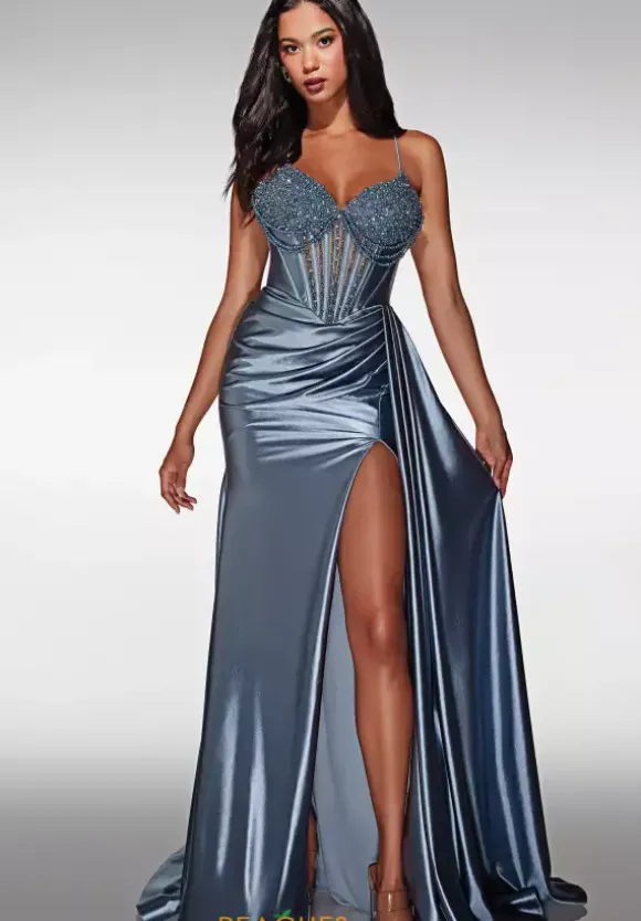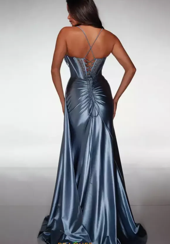 This metallic shining Alyce Paris brand new 2026 prom dress style 62160 encapsulates everything that you need for that hourglass figure. Dress your curves in form fitting satin fabric that exudes a luminous luster through elegant pleating and ruching that enhances your curves on the zipper closure. Dainty bright beads encrust the shimmering adjustable corset bodice.