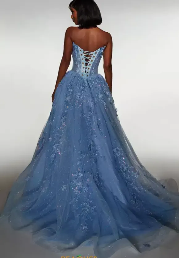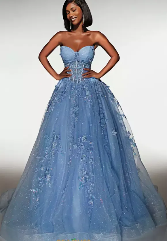 Do not miss out on the princess vibes this prom season when you dazzle in this glittering periwinkle a-line prom dress style 62163 designed by Alyce Paris. The adjustable lace back allows you to tighten the flower and glitter embellished mesh corset bodice to your liking. The lengthy tulle closed skirt flaunts a lavish horsehair hem and is complete with pockets.