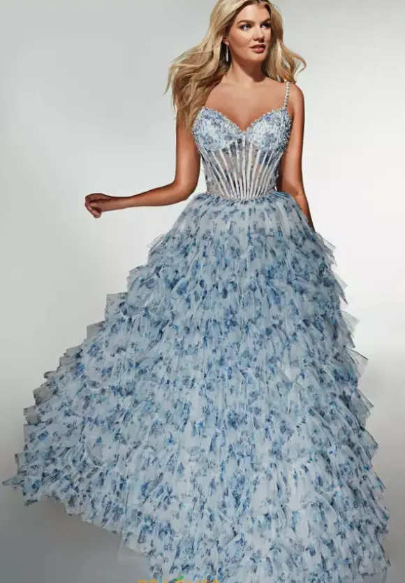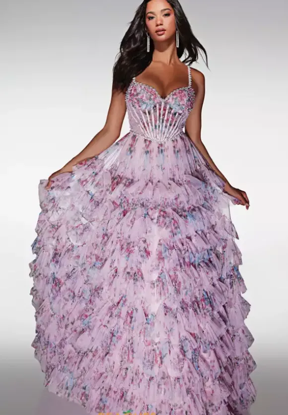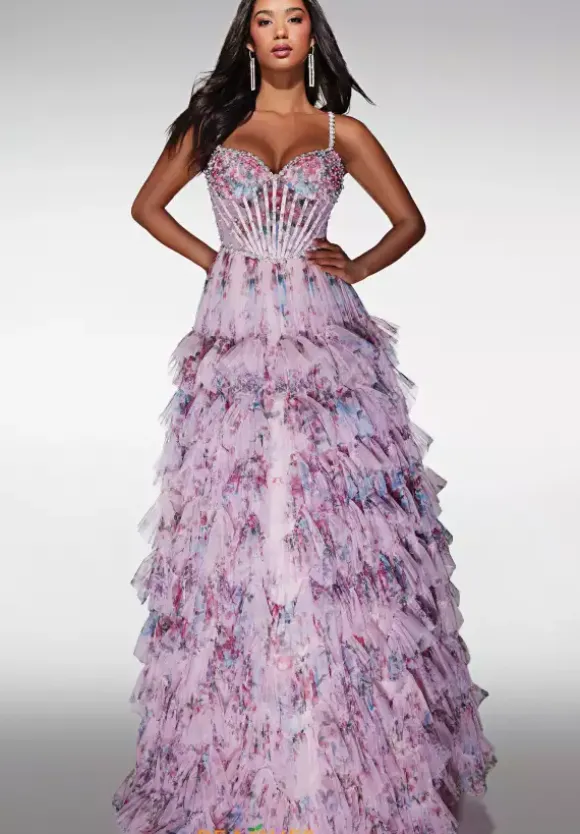 Be a show stopper at your prom in this ultra stunning Alyce Paris long dress style 62182 made in vibrant floral print tulle fabric. This sensational silhouette showcases a structured bodice with a sweetheart neckline adorned with pearls and beads with visible boning, thin beaded straps and zipper closure back. The long, a line skirt has tiered, ruffle layers with a back sweep train.