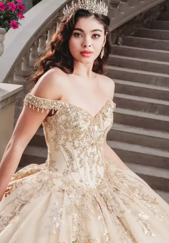 Fascinate all in sight in this sensational Amabella ball gown Q1000. All eye will be on you in this ravishing dress that features a modest sweetheart neckline and full ball gown skirt. Delicate off the shoulder cap sleeves highlight a lovely fringe embellishment. The fitted corset bodice is adorn in lavish lace appliques that cascade onto the skirt. Made in a tulle fabric, an alluring detachable train makes for a marvelous exit.