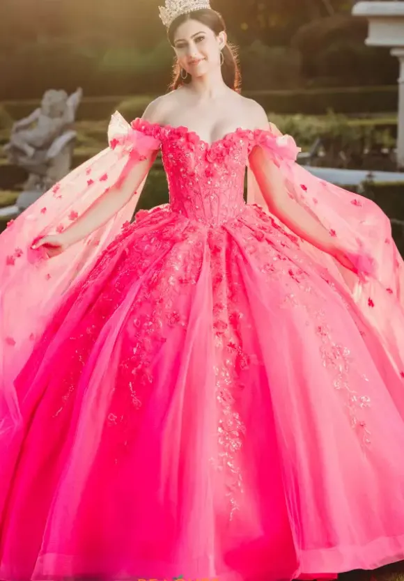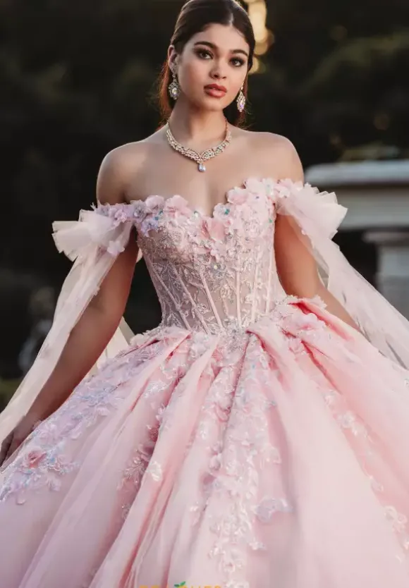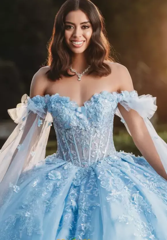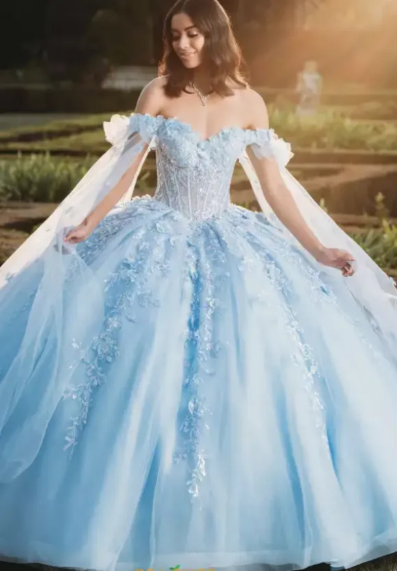 Exude confidence on your Quinceañera day in this fascinating Amabella ball gown Q1001. Whimsical and dashing, this gorgeous gown features a subtle off the shoulder neckline adorn in beautiful three dimensional floral detailing. Graceful detachable extra long angel sleeves give this dress a dramatic touch. Flattering on all, the corset bodice is embroidered in glistening appliques that cascade onto the full tulle skirt.
