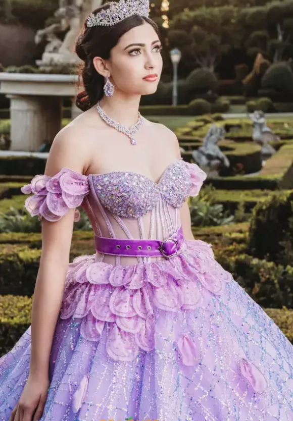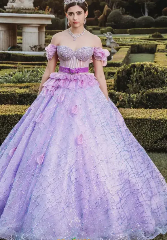 Whimsical and dashing, this lively ball gown style Q1002 by Amabella. Showcasing an off the shoulder neckline, delicate scalloped detailing highlight the cap sleeves. The sheer corset bodice highlights radiant stones that adorn the bust for the perfect pop of sparkle. Made in a glistening glitter tulle fabric the full ball gown skirt makes for a grand exit.