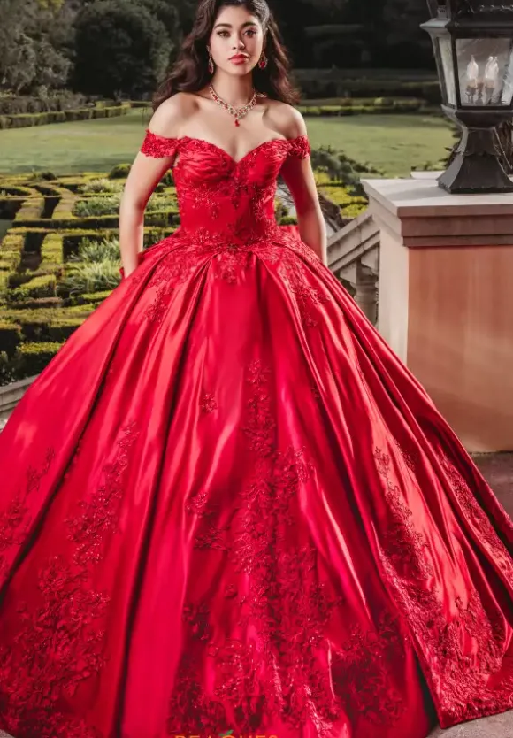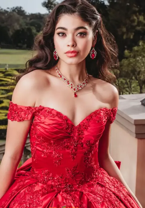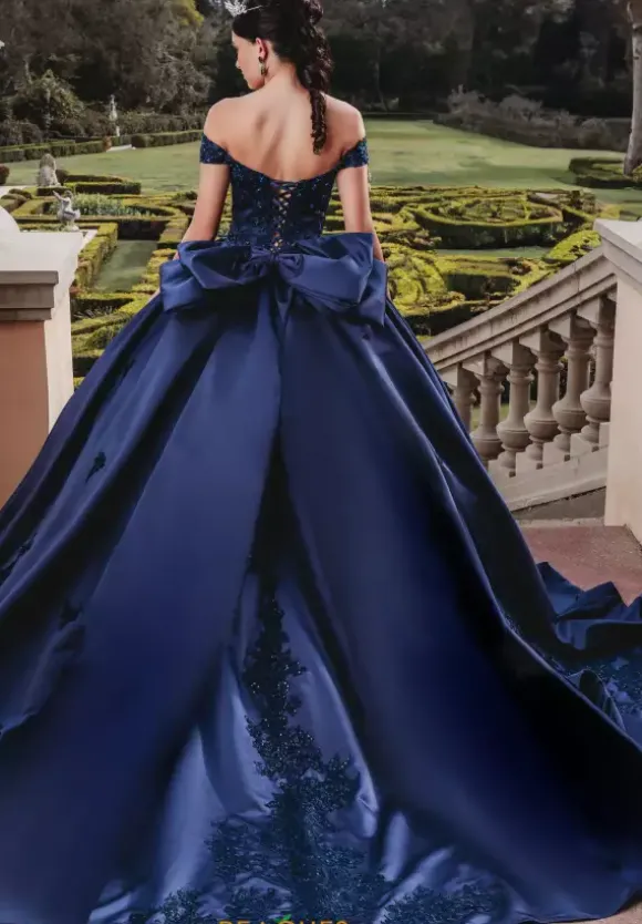 Exquisite Amabella ballgown style Q1008 stands out with lush satin material that exudes elegance. Displaying a fitted corset bodice adorned in lovely lace applique and shimmering beading. Ruching and off the shoulder cap sleeves stylishly elevate the sweetheart neckline. More applique gracefully embellishes the full skirt that is topped off with a refined Detachable bow.
