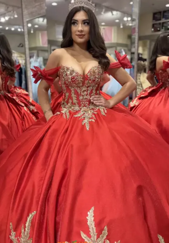 Refined Amabella ballgown style Q1010 is made out of lovely mikado material. The corset bodice features graceful lace material, corset boning, and absolutely stunning beaded applique with unique lace off the shoulder cap sleeves. More of this ornate applique borders the voluminous skirt and adorns the fabulous detachable bow.