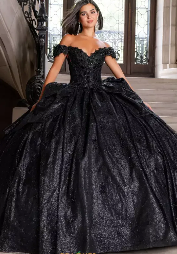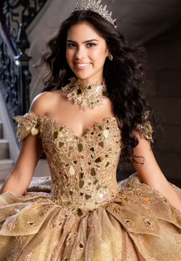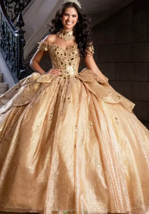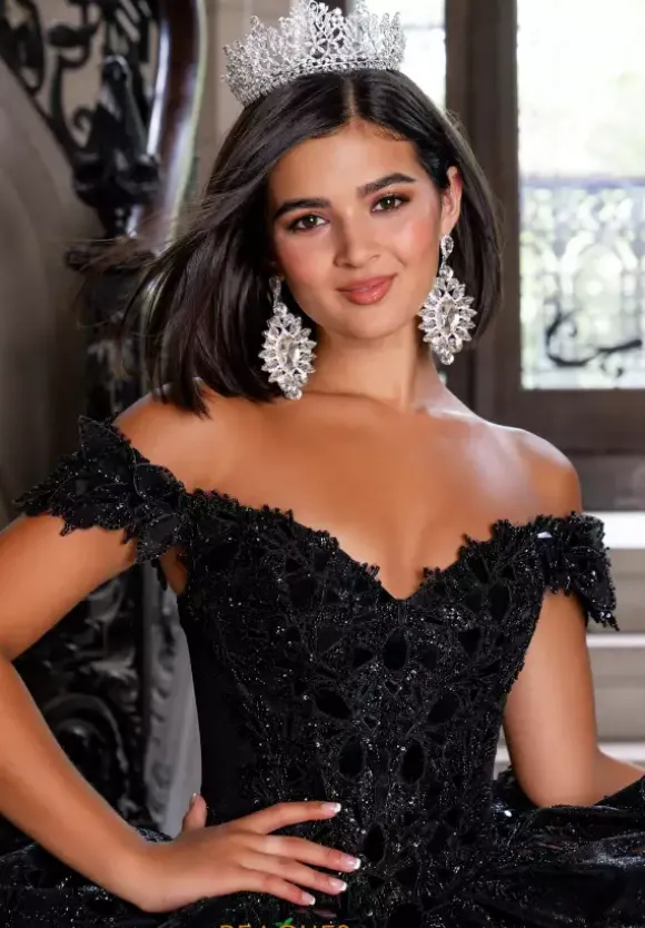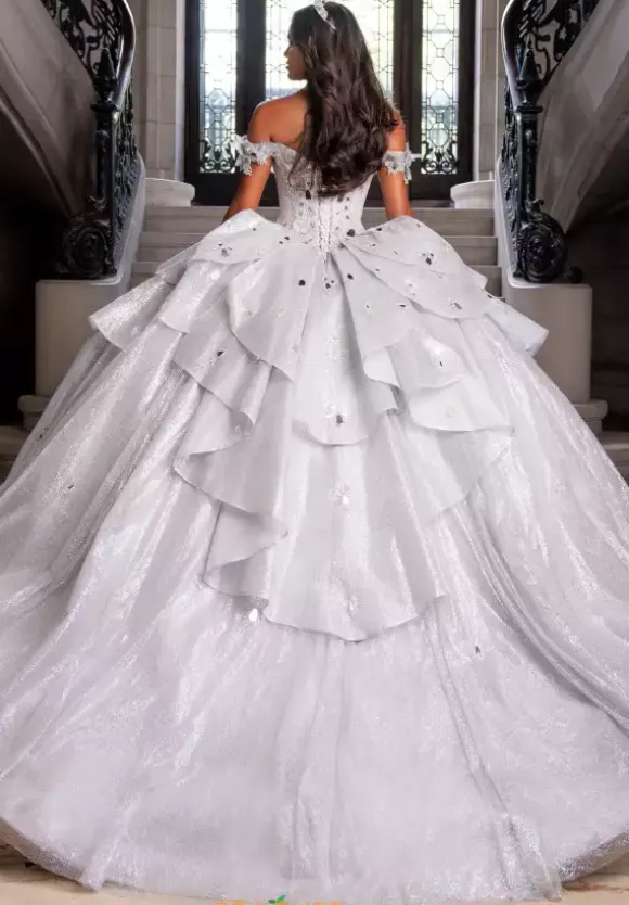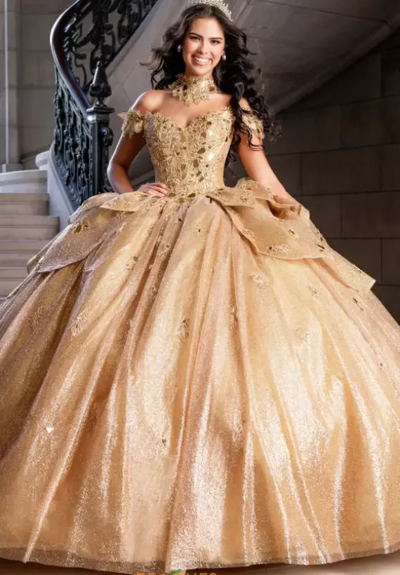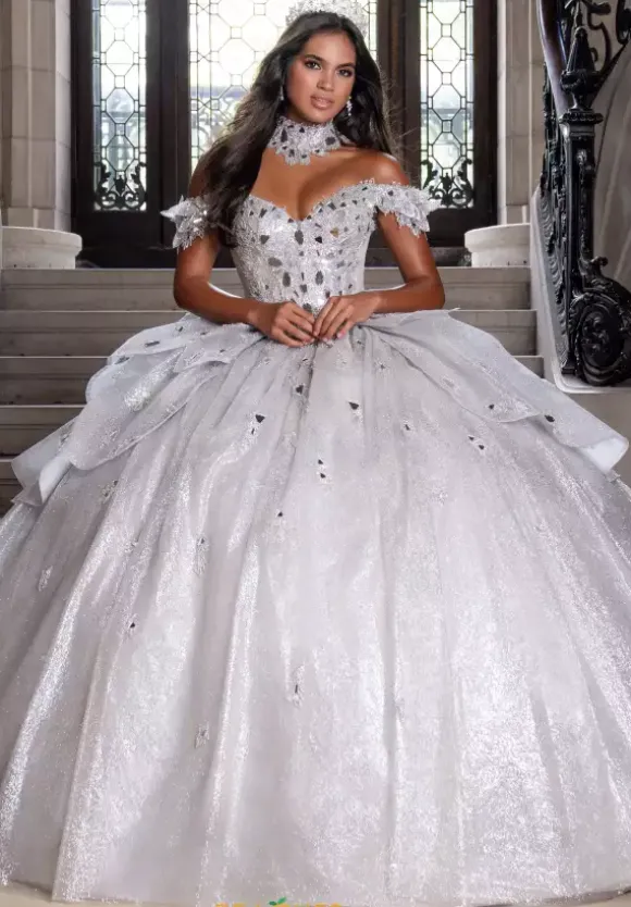 Capture the spotlight with this Quinceanera dress by Amabella style Q1020. The sweetheart neckline paired with off the shoulder cap sleeves match the choker necklace perfectly because of the stunning cut glass and beading. The bodice is supported by the corset lace up in the back of the dress that seams beautifully with the huge stunning bow. The skirt contains glitter tulle and beading with a train which is the perfect final touch.