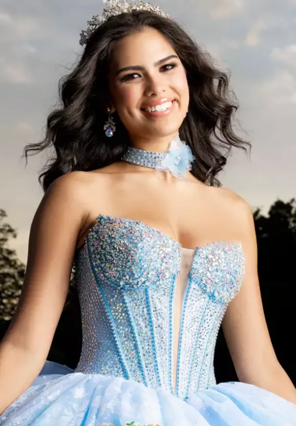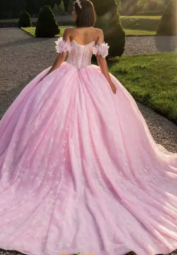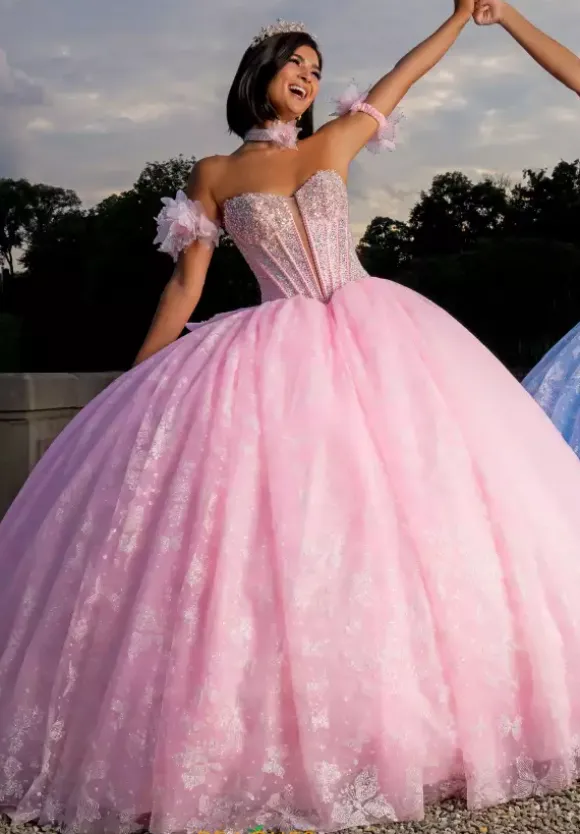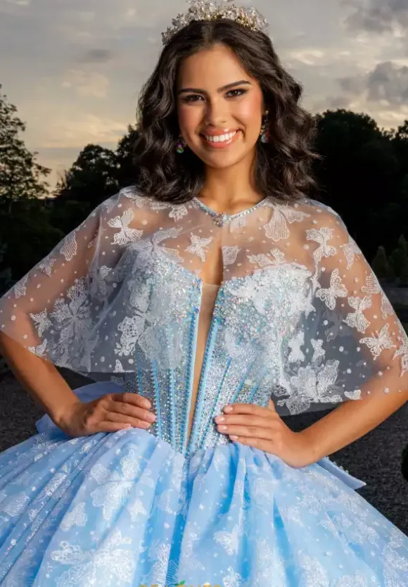 Allure attention when you wear this beautiful dress by Amabella style Q1036. This Quinceanera dress features a strapless scoop neckline with a mesh panel paired with tulle cap sleeves that match the choker necklace. The corset is supported with a lace up that flows to reveal a cute bow. The skirt contains beading and glitter tulle with butterfly novelty patterns. The finishing touches are a beautiful capelet that match the skirt and a stunning train.