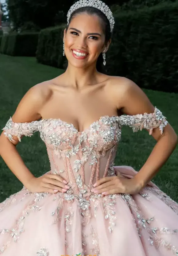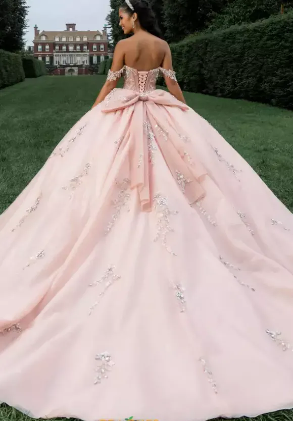 Feel like a princess on your special day. This Amabella ball gown , style Q1038, features a stunning off the shoulder sweetheart neckline and detachable sleeves, allowing you to switch up your look throughout the day. Made from luxurious tulle material, this gorgeous dress is adorned with glamorous beading and lovely applique detailing. The long bow and train will make you feel you’re living in your fairy tale dream.