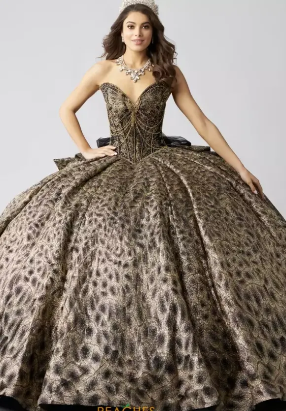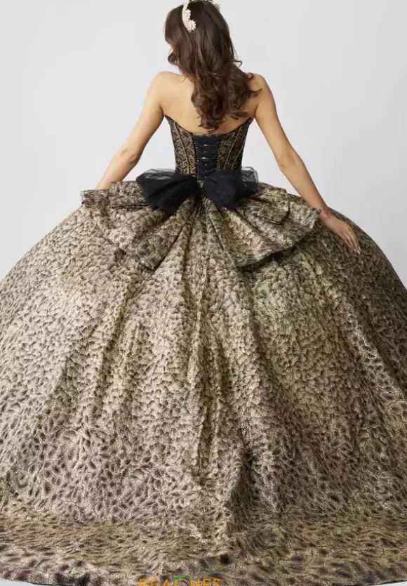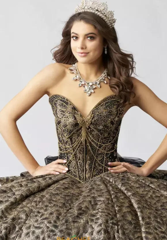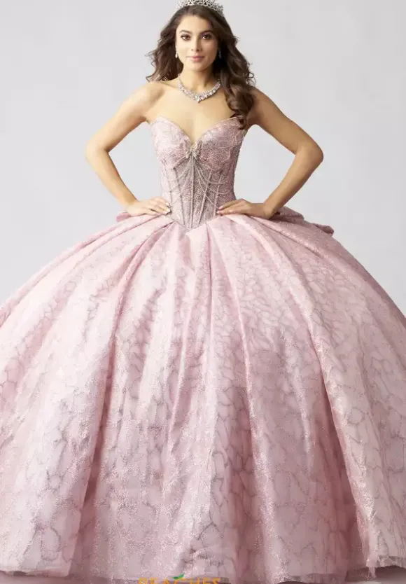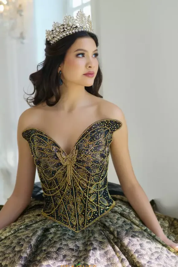 Make a statement in this eye catching ball gown, designed by Amabella, style Q1060. This unique quinceanera dress features a strapless v neckline designed in the form of a butterfly wing. Made from glitter tulle material, the beadwork on the corset bodice is truly phenomenal. With this timeless train and alluring bow, this dress is one of a kind.
