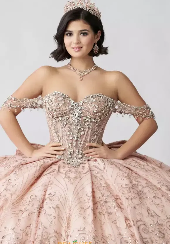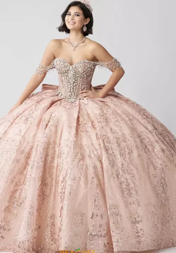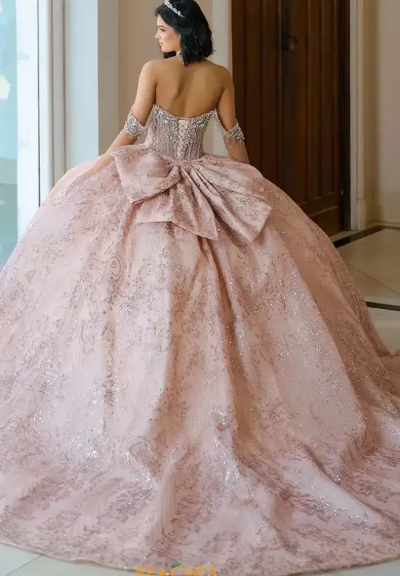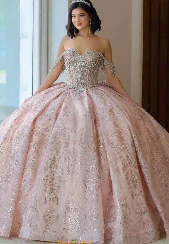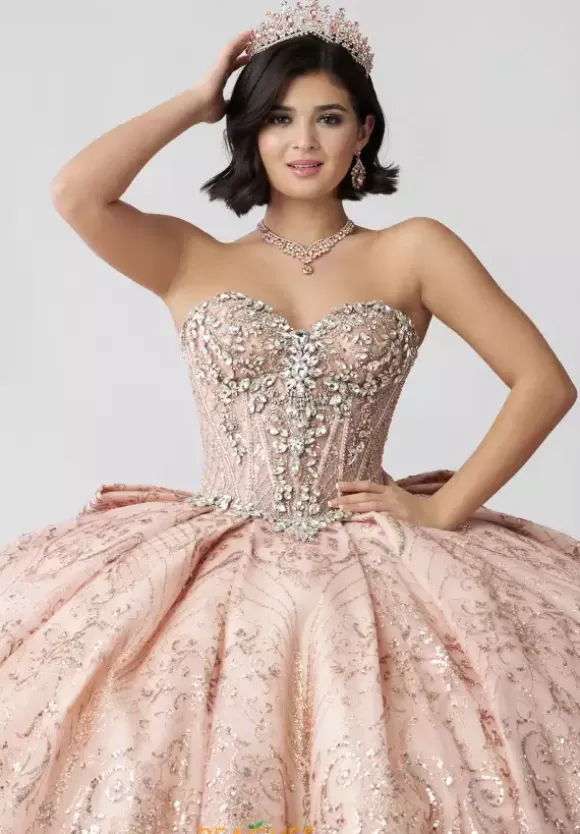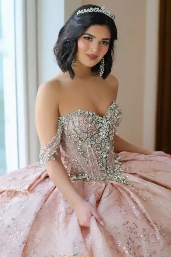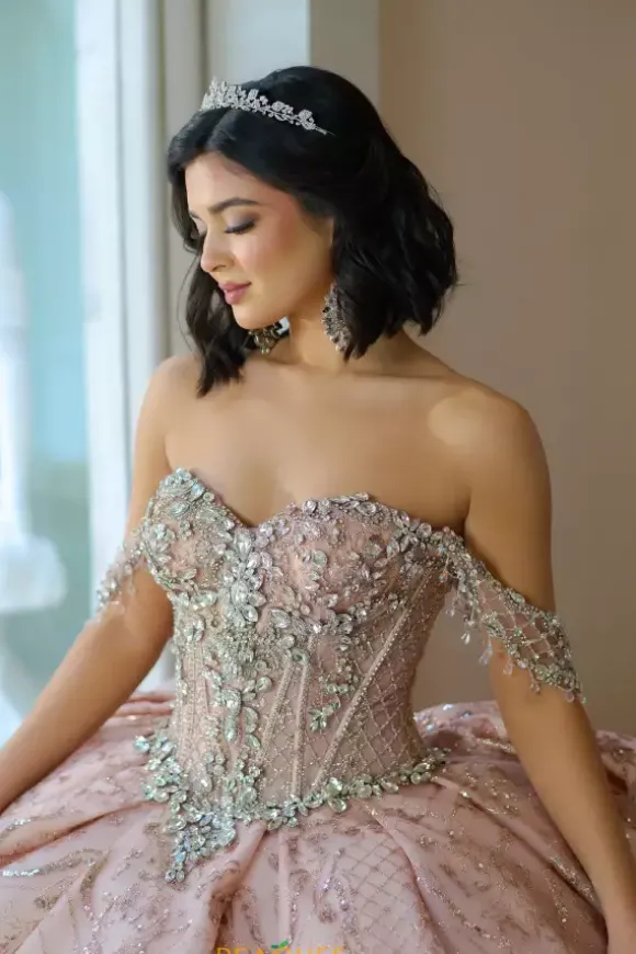 Feel regal and royal in this stunning ball gown from Amabella style number Q1066. This sweetheart neckline dress showcases detachable off the shoulder cap sleeves bejeweled with rhinestone bead work. The long waisted bodice has those matching rhinestone details all long it with exposed boning. The ball gown skirt is made from a sparkling glitter tulle that shimmers effortlessly. Complemented with a bow in the back.