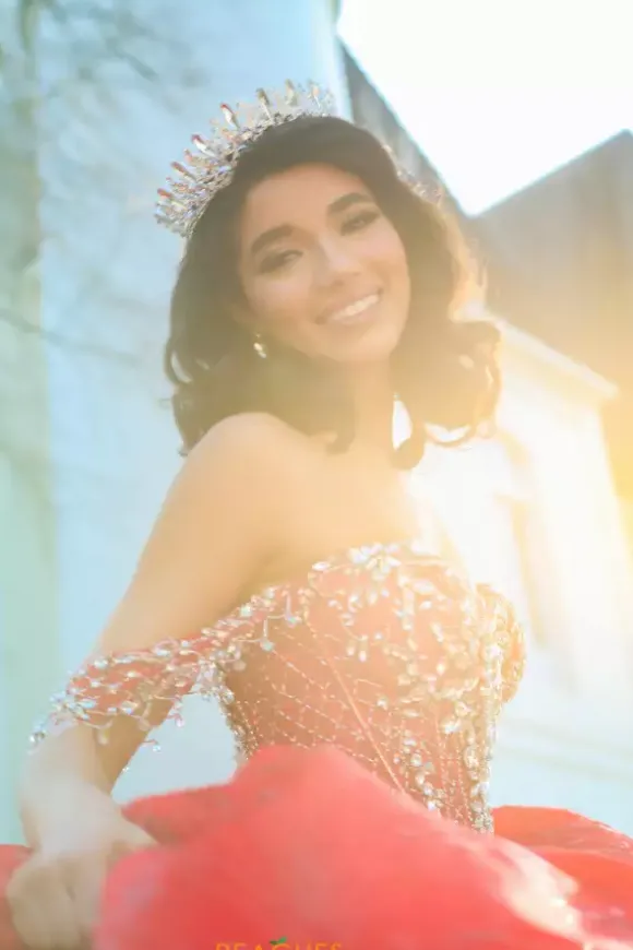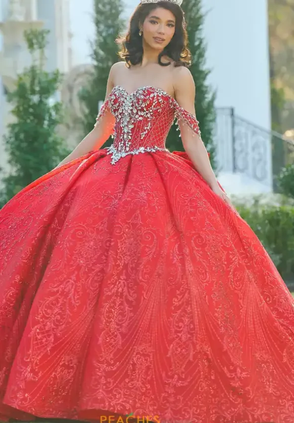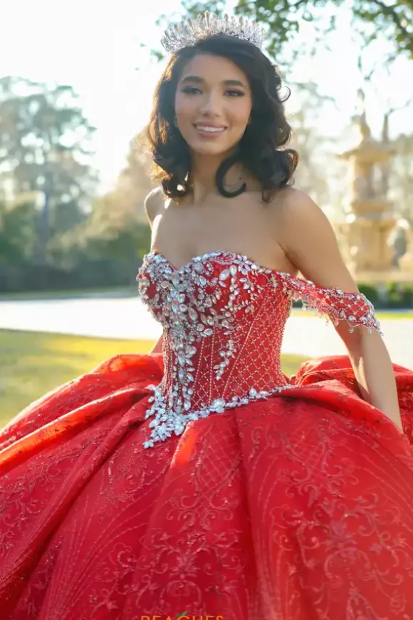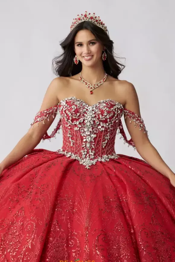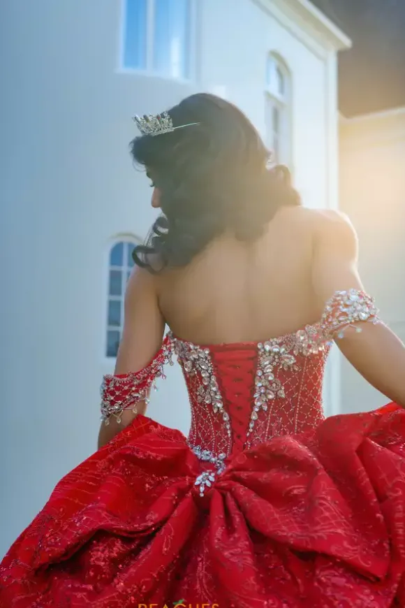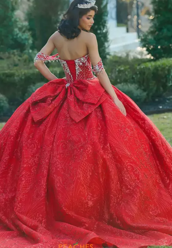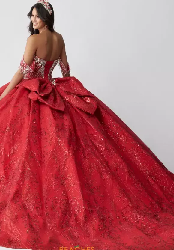Feel regal and royal in this stunning ball gown from Amabella style number Q1066. This sweetheart neckline dress showcases detachable off the shoulder cap sleeves bejeweled with rhinestone bead work. The long waisted bodice has those matching rhinestone details all long it with exposed boning. The ball gown skirt is made from a sparkling glitter tulle that shimmers effortlessly. Complemented with a bow in the back.