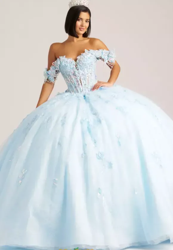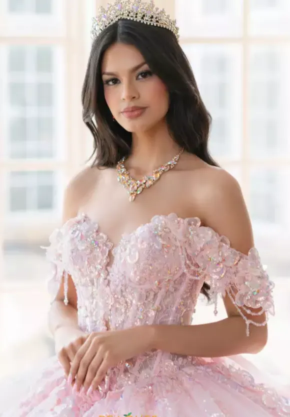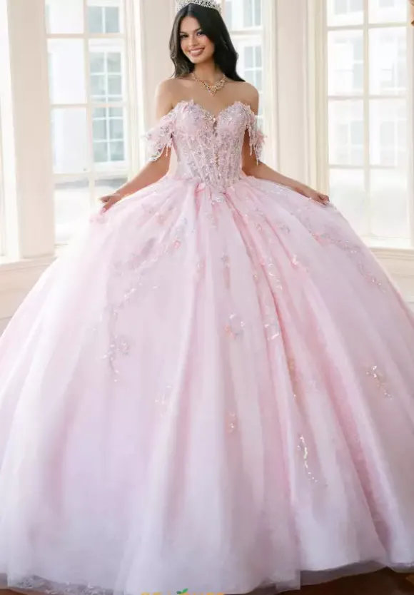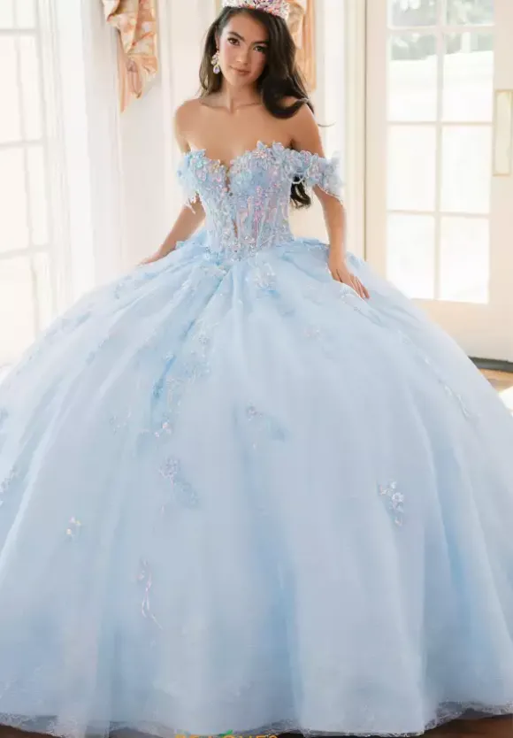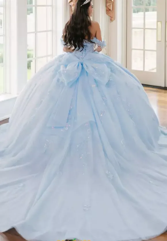 Sweet and elegant in this Amabella ball gown style Q1038. Available in light colors, this detachable off the shoulder cap sleeve sweetheart neckline corset has a deep v opening in the middle. Gorgeous three dimensional flowers adorn the cap sleeves as well as the bodice and onto the full tulle skirt. The back features a detachable bow.