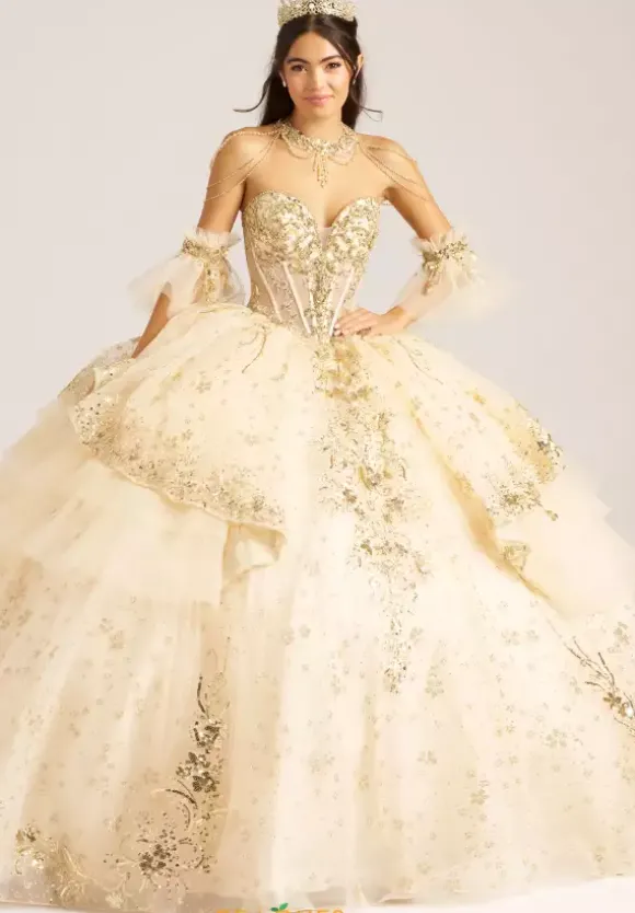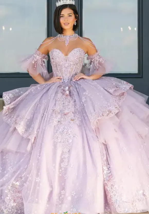 Feel like a modern day fairy tale princess in this chic Amabella ball gown style Q1096. This strapless sheer illusion long waisted bodice has a strapless sweetheart neckline. A gorgeous chocker neckline has hanging fringe beaded that drapes your shoulders. Detachable cap sleeves add to the gorgeous look with is completed by the glitter tulle on the skirt.