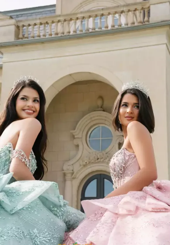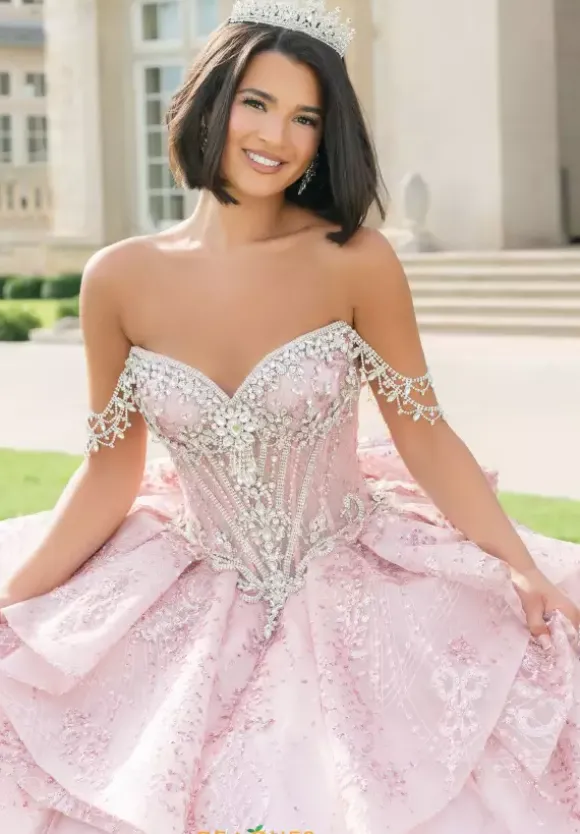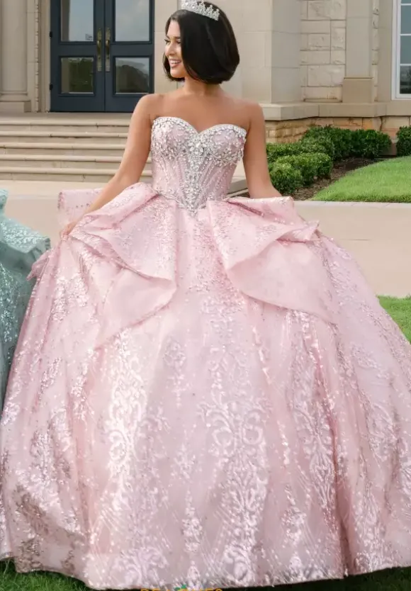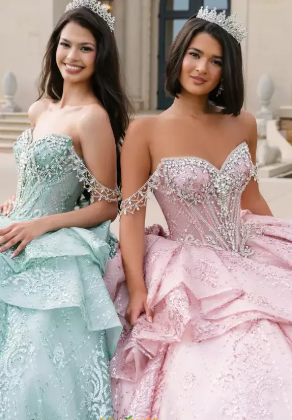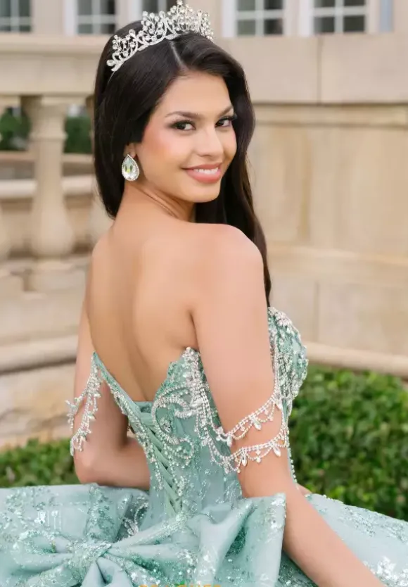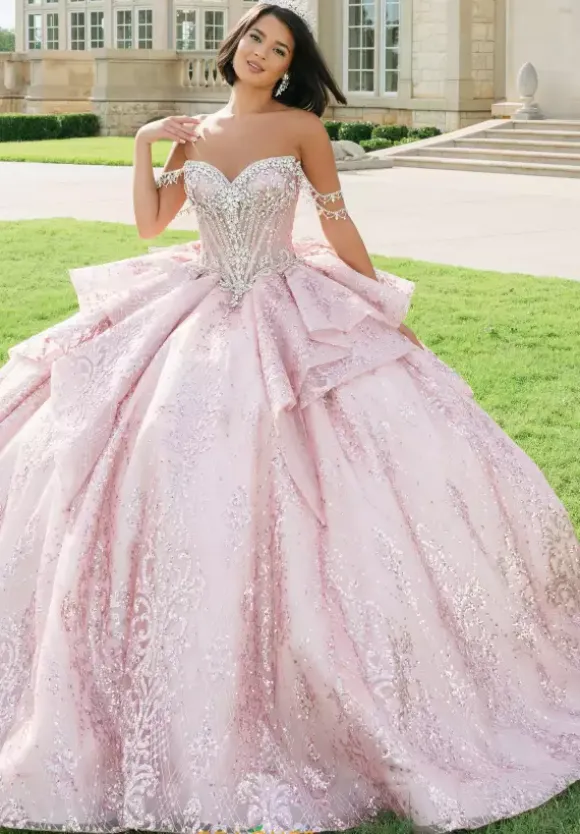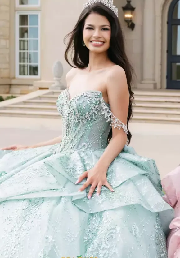 This Amabella ball gown is absolutely breath taking. Style Q1097 has it all with its strapless sweetheart corset that has detachable off the shoulder rhinestone cap sleeves. The bodice is bejeweled with matching hand sewn beadwork where it mets the glitter appliques ball gown skirt. The back of the dress has a detachable bow detail.