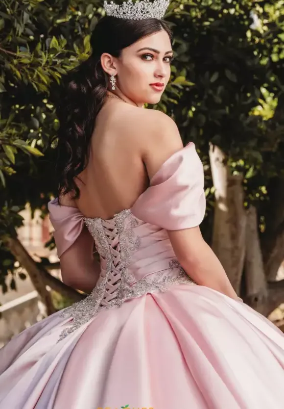 Exude regality in Amabella ballgown style QA101, made out of lush satin material that looks effortlessly elegant. Displaying an incredible corset bodice with ruching and graceful applique complimented by intricate beadwork. The neckline can be worn as strapless or with lovely off the shoulder cap sleeves. The voluminous skirt is topped off with a fabulous bow. Detachable off the shoulder sleeves and bow included.