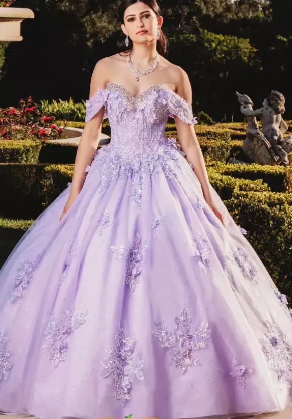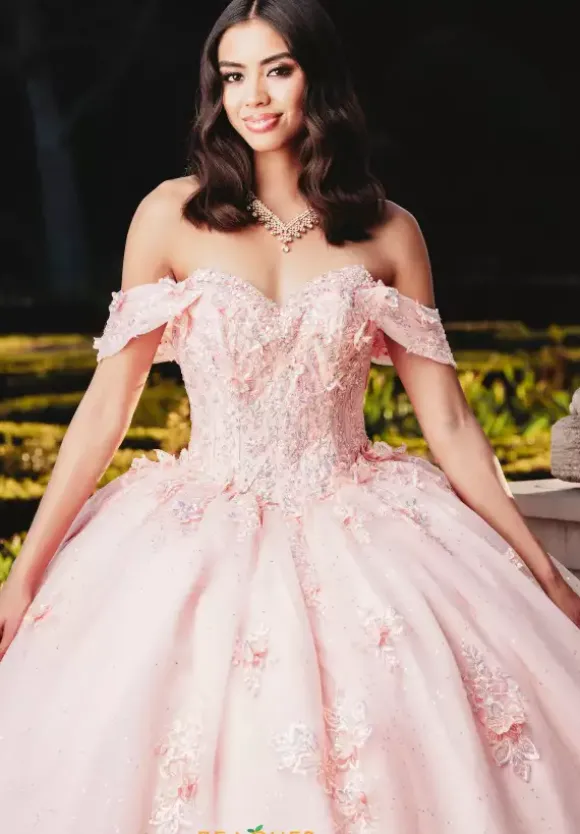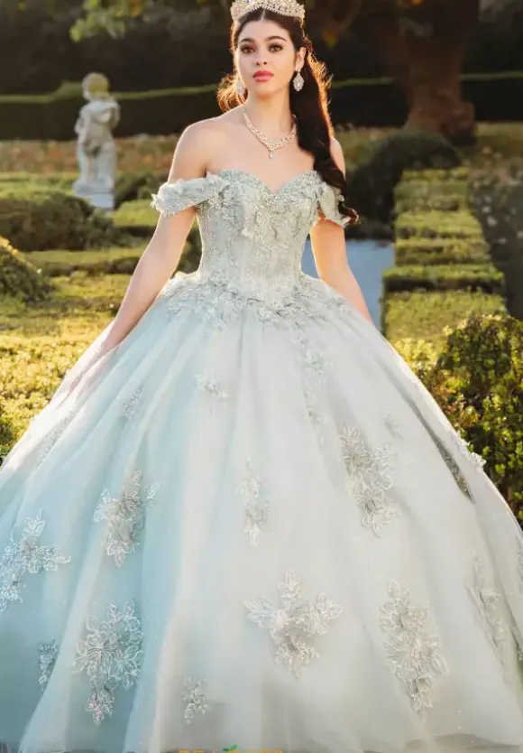 Breathtaking Amabella long dress style QA104 showcases a fitted corset bodice featuring an elegant sweetheart off the shoulder neckline with appliqued tulle cap sleeves, and displays gracefully intricate beadwork. The dramatic glittering tulle skirt rains down with more applique cascading throughout. Detachable bow.