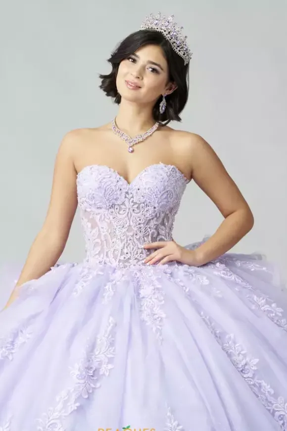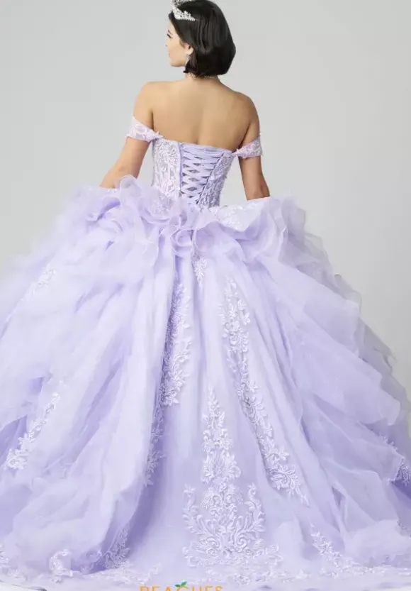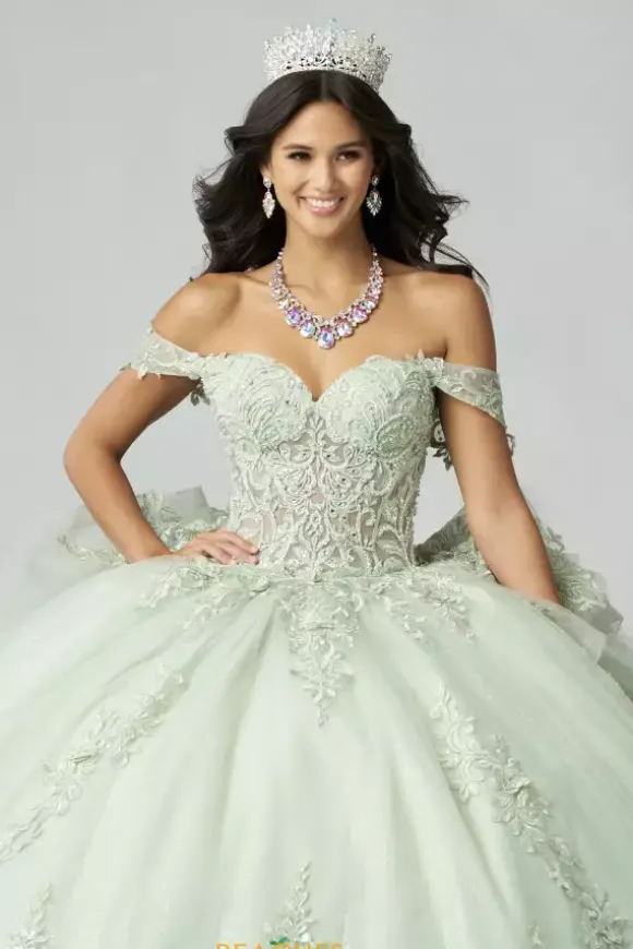 Make a lasting impression in this breathtaking Amabella ball gown style QA153. Available in stunning pastel colors, this dress showcases a off the shoulder cap sleeve that is detachable and sweetheart neckline bodice. Embroidered style lace appliques adorns the bodice and trickles down the glittery tulle skirt. The back of the dress showcases ruffles long the train.