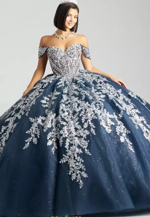 We are just in love with this metallic sparkling ball gown from Amabella style QA161. The sweetheart neckline bodice has detachable off the shoulder cap sleeves. The bodice features this striking metallic grand appliques that pop against the dark color of the dress. The full glitter tulle ball gown skirt continues those appliques dripping down the skirt with a detachable bow in back.