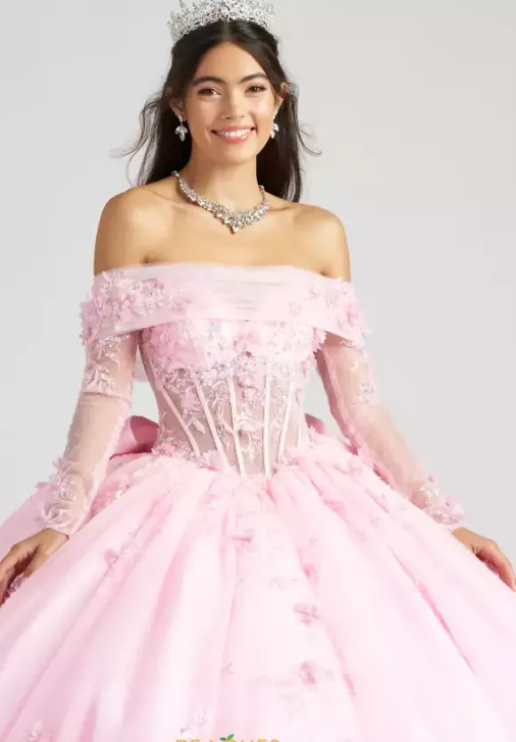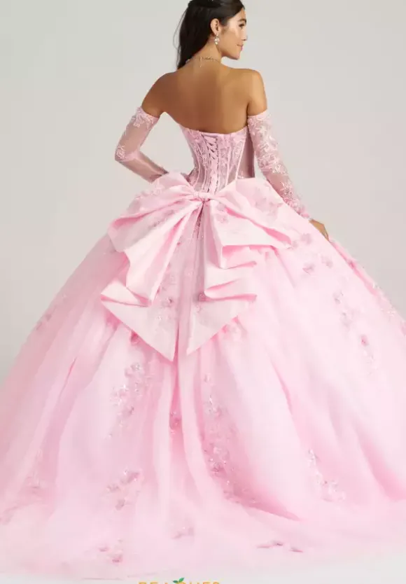 Feel regal and gorgeous in this Amabella ball gown style QA165. The strapless sweetheart bodice is made from a sheer illusion with striking floral appliques throughout. A detachable shawl can be worn over the bodice with detachable sleeves to give it a two in one look. The full tulle ball gown skirt has detachable bows in the back as well.