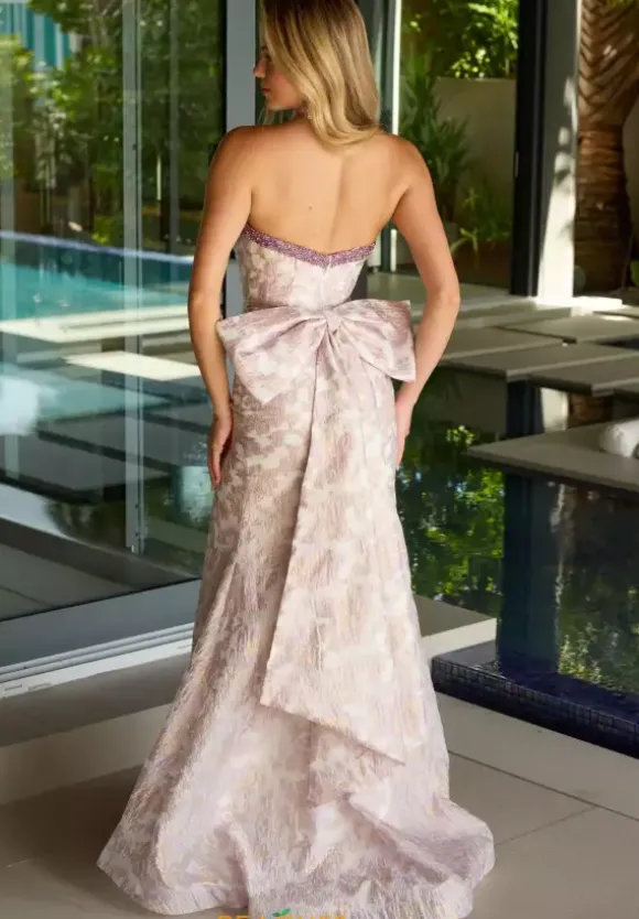 Leave that everlasting impression wearing shocking long style 42282 by Ava Presley. The strapless straight across neckline is daintily embellished with beadwork that lines the time of the neckline. Beautifully cut from a brocade material in a fit and flare silhouette detailed with a thigh high slit and a lovely detachable bow to match.