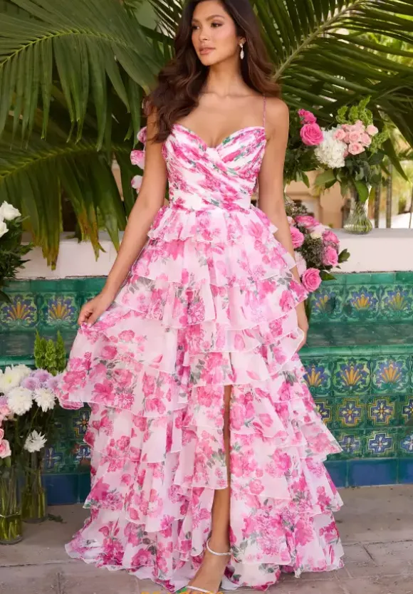 Make a jaw dropping appearance at your next special event in this floral print a line gown by Ava Presley 42332. This chiffon gown showcases a v cut neckline with dainty straps that are given a dangling floral design. This gorgeous gown is adorned in a stunning floral print that will have you stand our from the rest.