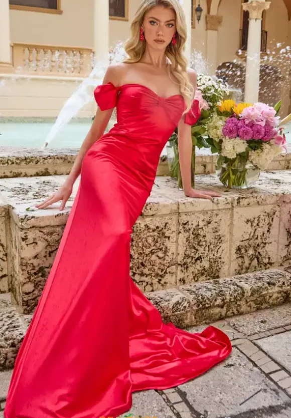 Exude elegance at your next event when wearing this long fitted dress by Ava Presley, style 47178. Showcasing a open back and sweetheart neckline with off the shoulder cap sleeves paired with a lovely bow. The long sweep train flows gracefully behind you. Made in satin material giving you that phenomenal picture perfect look.