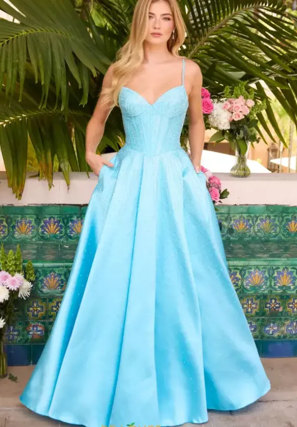 Feel like a true princess at your next special event wearing this long A line dress by Ava Presley, style 47192. This satin dress showcasing a V neckline and a lovely structured corset. The voluminous skirt flows beautifully into a stunning train. Adorned in glistening beadwork, ensuring you shine all night.