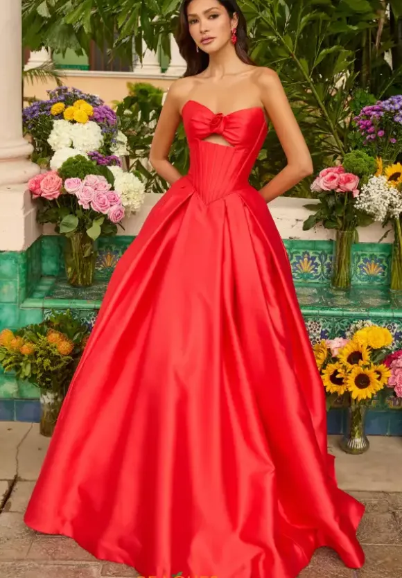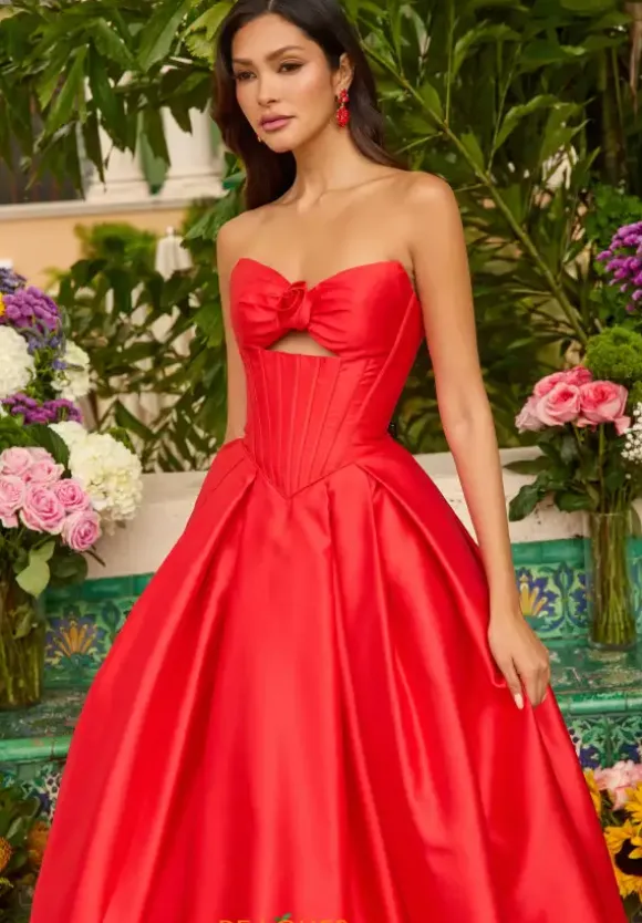Bring the princess vibes when you show up to prom in this ball gown from Ava Presley dress style 47223. Made from sleek satin material, this dress has a strapless sweetheart neckline with a three dimension flower front of the bust above the key hole opening. The waist is corset structured with a drop waist.