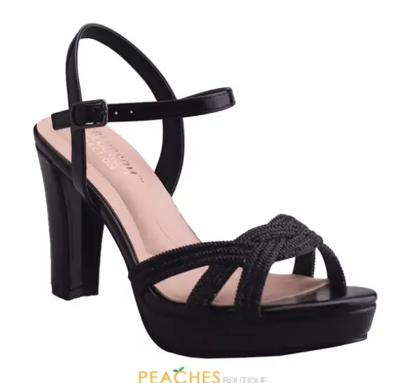 Added these Amara-60 by Blossom to your gorgeous dress to add a little sparkle and sophistication. The metallic black heel has an ankle strap that is adjustable. The woven pattern of rhinestones adorn the strap that goes across your open toes. A platform from makes the shoes extra comfortable.