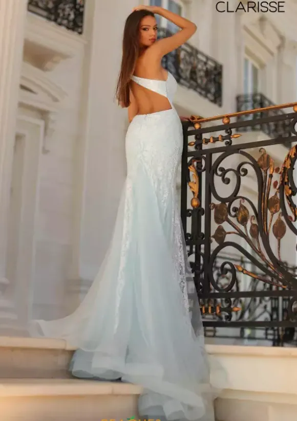 Show stopping long dress 810205 by Clarisse showcases a single strap and mermaid silhouette. Fabricated with beautiful lace and tulle material adorned with beading, this gorgeous gown showcases an asymmetrical neckline and cut out back. The long mermaid skirt will show off your figure and has a sweeping back train