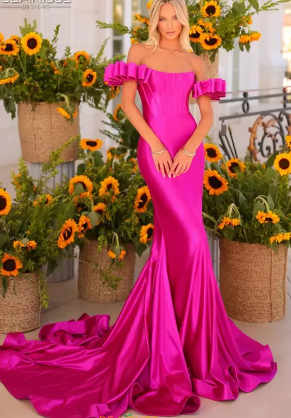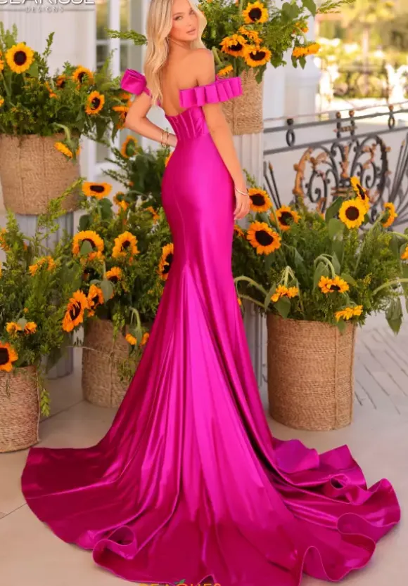 Feel like you just stepped off the red carpet when wearing this glamorous long dress from Clarisse style 811160. Featuring a strapless scoop neckline with a one of a kind detachable off shoulder sleeves and a corset bodice. This dress is made out of a soft jersey material and adding to this number is the long train.