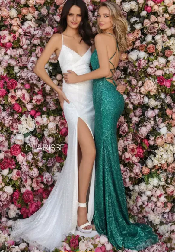 Make a bold fashion statement and rock this Clarisse Couture fitted style 8177 for your senior prom. This beautiful dress showcases a lovely v cut neckline and contains a stunning corset lace back to accentuate your natural curves. Highlighting a striking glittery cracked ice effect and alluring thigh high slit, you surely will be queen.