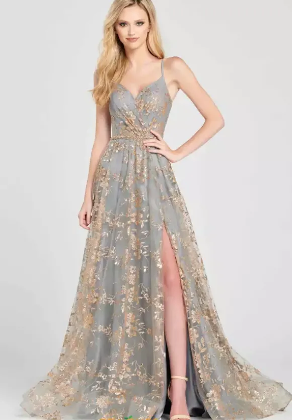 Look stunning at prom in this A Line gown from Colette style CL12006. This show stopping dress features a slit and a v neckline with thin straps that trail into a sexy corset lace up back. Embellishments like the floral detail, beads, and sequins give it an extra shine that makes it the perfect dress. Find more Colette styles at Peaches Boutique
