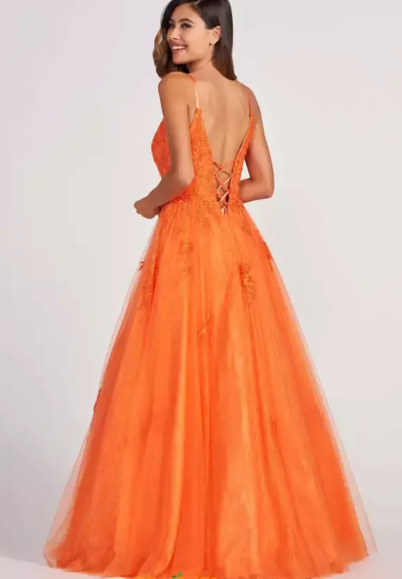 Make a statement with fun and vibrant A line dress CL2025 by Colette. This dress is stunning from head to toe with captivating lace details and glistening beads. The fitted bodice displays a plunging V neckline with a mesh piece for modesty along with stunning appliques that scatter throughout the skirt.