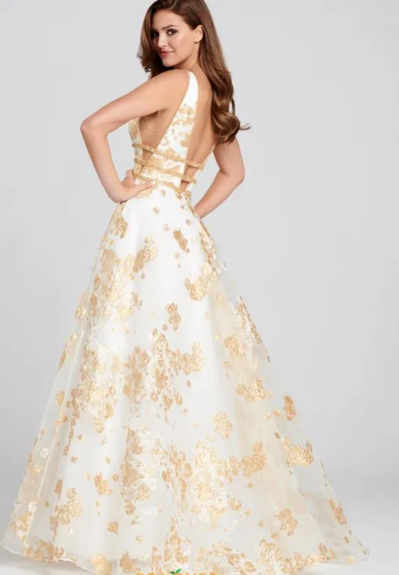 Wear this classic style EW120063 by Ellie Wilde and you are sure to leave a long lasting impression. Sets off with a plunging v neckline and a bodice that has a set of three beaded belts that will accentuate your figure. Made in a rich jacquard material, its full a line silhouette will let you dance the night away.