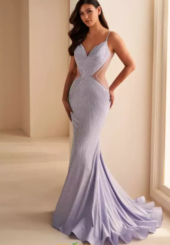 Shimmer and shine all night long at your next social occasion in this dazzling long dress style EW35001 by Ellie Wilde. This scintillating silhouette is drenched in slimming lines of heat seat sparking stones and showcases fitted bodice with a V neckline, illusion side panels, spaghetti straps and low open back. The slim fitting long skirt has a horsehair hem edge and sweep train.