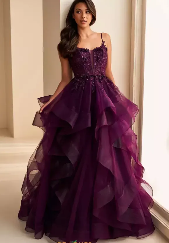 Have all eyes in you when making your grand entrance in your next event wearing this outstanding long A-line dress from Ellie Wilde style EW36225. Showcasing a plunging scoop neckline with mesh and thin matching straps. It has a lace up back corset bodice that is adorned by ravishing beads, sequins and lace applique. Adding the attention to you is he ruffled multilayered tulle skirt.